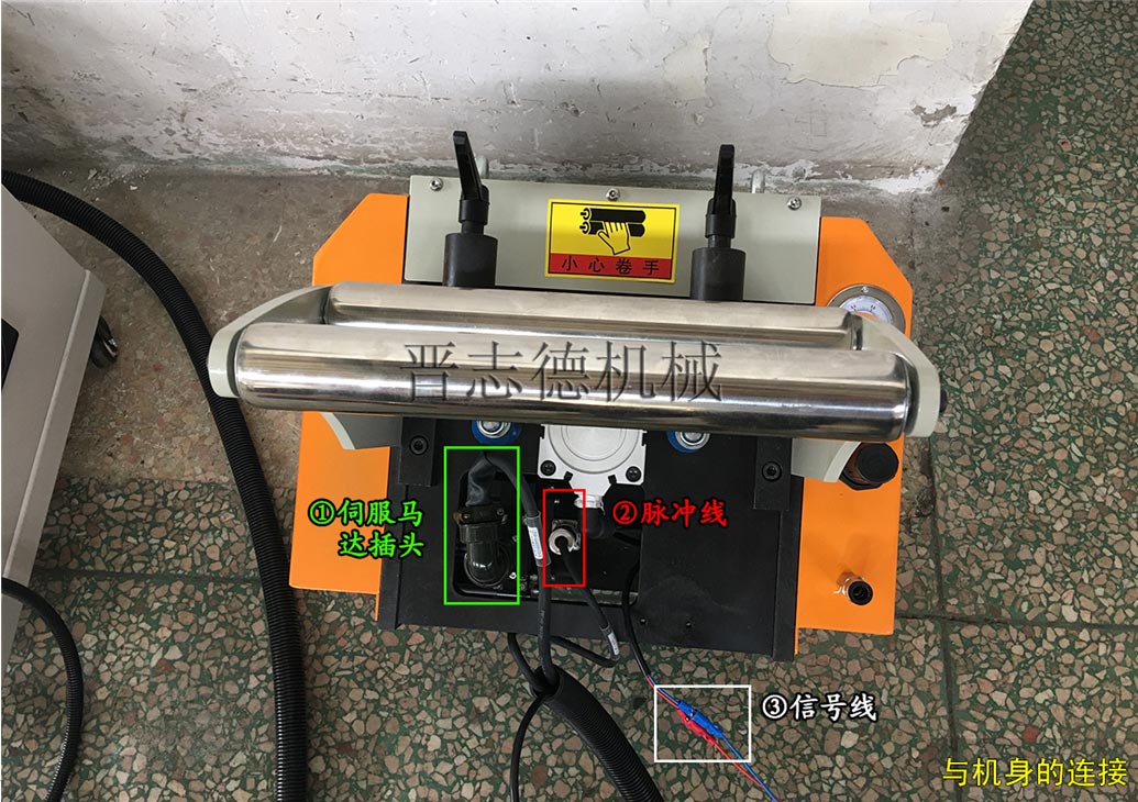 第三步、与电控箱、冲床凸轮信号连接。晋志德NC伺服送料机机身上有伺服马达信号接口、送料放松凸轮信号接口线需分别与其自带的电箱和冲床的凸轮信号相连,【注意:传统机械大飞轮冲床没有凸轮,需额外加装凸轮片、接近开关实现信号传递,此类冲床安装送料机比较复杂,请咨询晋志德售后人员】实现自动化送料、放松动作。