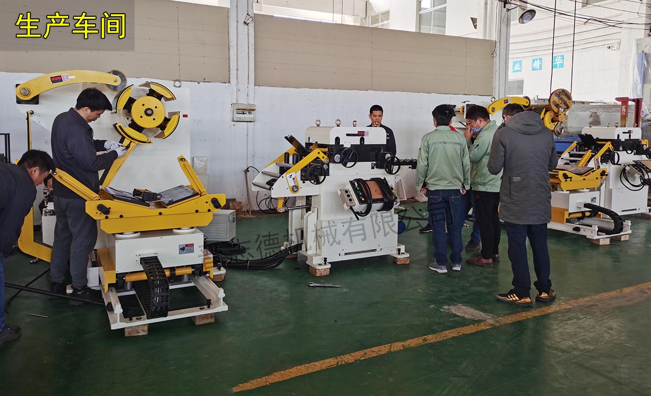 随后,一行人前往成品展示区进行参观,厂长张小飞特别安排了对热销的三合一送料机、二合一料架兼整平机、重型材料架、整平机设备进行了接线试机,看着一台一台冲床自动化设备在电控箱上简单操作后,全自动化的运行,大学生们不时发出赞叹之声。在厂长张小飞的讲解下,大学生们对车间中各类冲床自动化设备都有了大致的了解,也对工厂有了更加详细的了解。